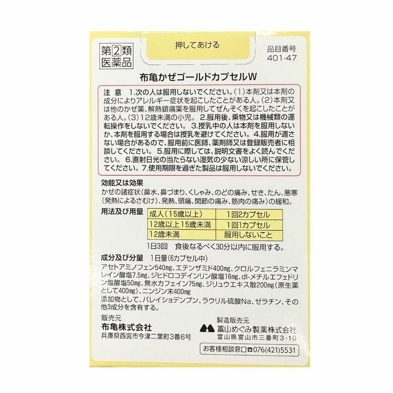 布亀かぜゴールドカプセルWは、非ピリン系解熱鎮痛薬、中枢性の鎮咳薬、抗ヒスタミン薬、生薬などを配合し、「かぜ」による発熱・せき・痛み・鼻みずなどの諸症状に効果をあらわすかぜ薬です。