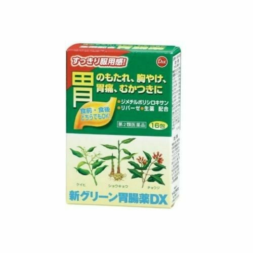 新グリーン胃腸薬DXは、消化酸素をはじめ、健胃生薬、制酸剤、粘膜修復のはたらきをもつ成分をバランスよく配合した複合胃腸薬です。