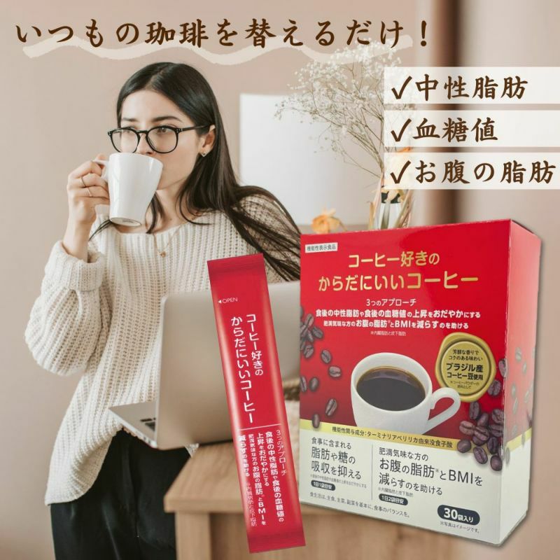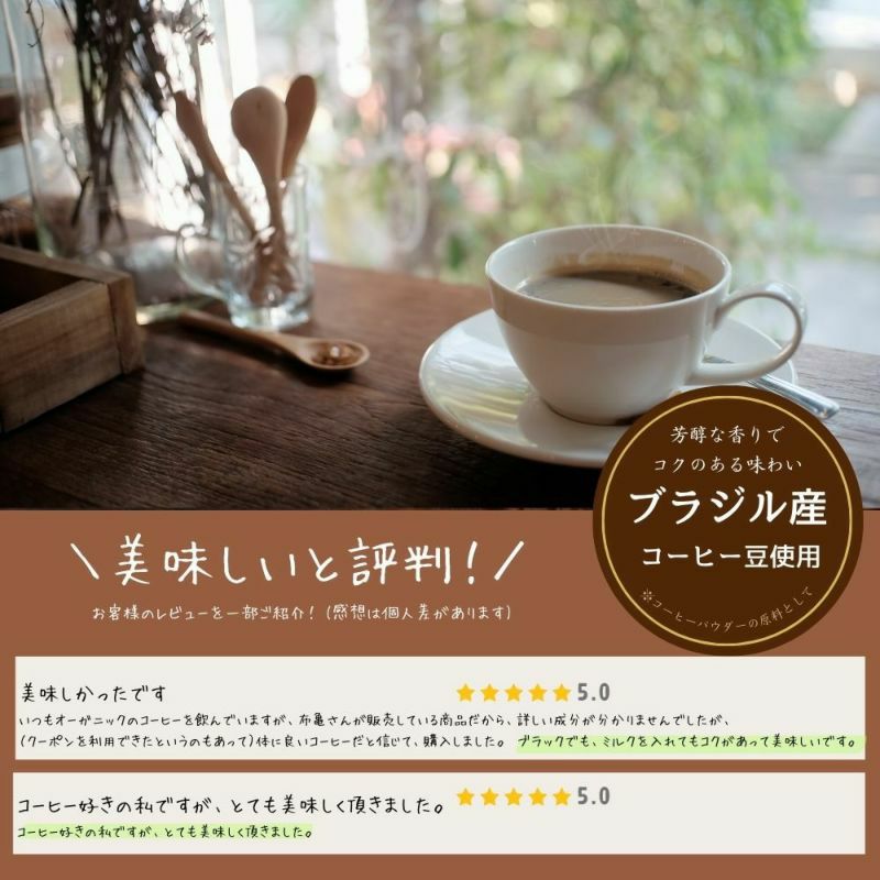 コーヒーパウダー(ブラジル製造)、還元麦芽糖、ターミナリアベリリカ抽出物、ギムネマシルベスタ抽出物/甘味料(スクラロース)、アルギン酸
