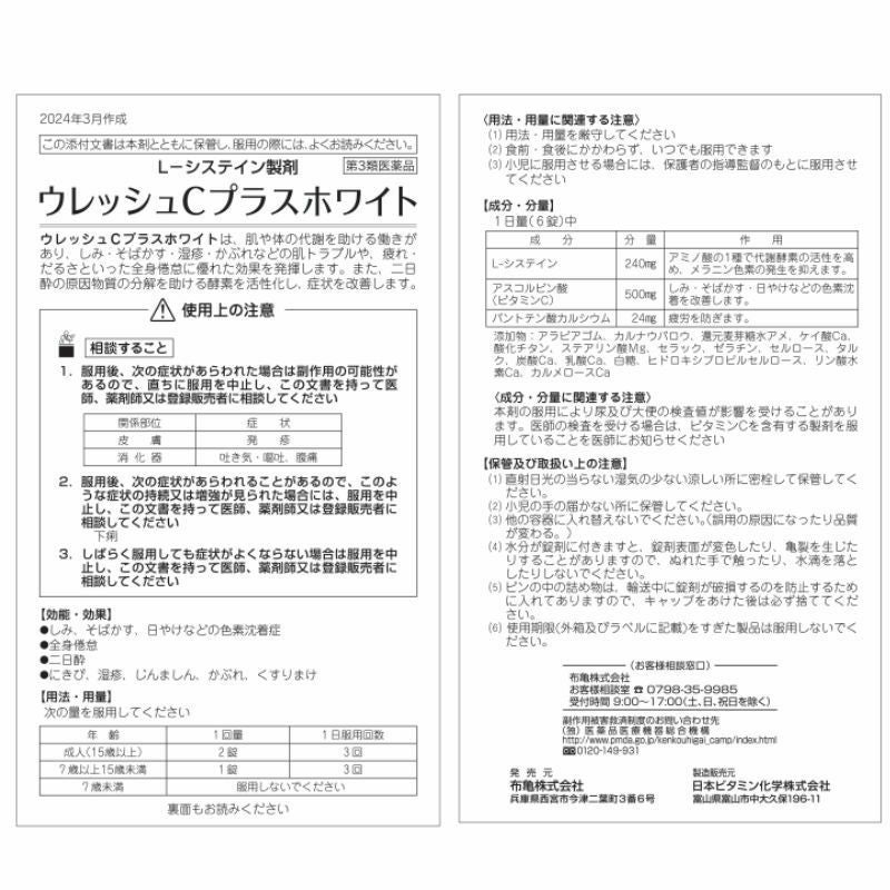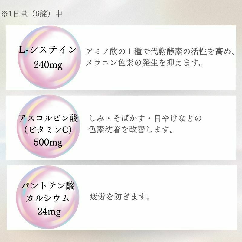 1日量(6錠)中 L-システイン240mg、アスコルビン酸(ビタミンC)500mg、パントテン酸カルシウム24mg