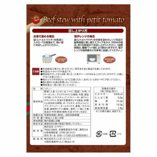 野菜(ニンジン、じゃがいも、トマト)(国産)、牛肉、ソテーオニオン、デミグラスルウ(小麦粉、牛脂、食塩、その他)、トマトケチャップ、トマトペースト、赤ワイン、チキンエキス、乳等を主原料とする食品、砂糖、たん白加水分解物、ポークエキス、おろしにんにく、ブラックペッパー、オールスパイス、食塩/カラメル色素、調味料(アミノ酸等)、香料(一部に小麦・入成分・牛肉・豚肉・大豆・ゼラチンを含む)