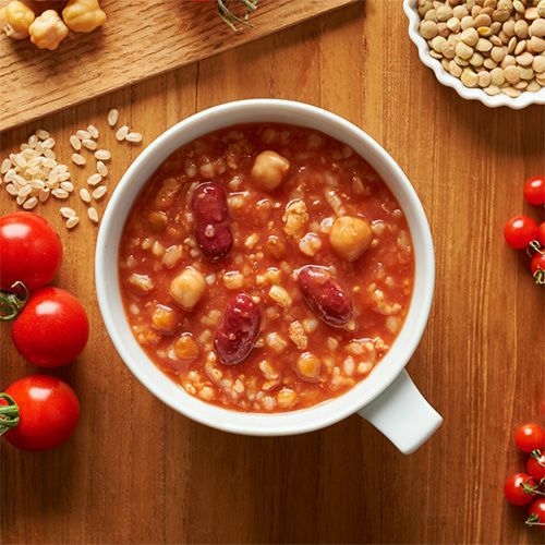 うるち玄米(熊本県産)、トマトペースト、鶏肉、たまねぎ、レンズ豆、レッドキドニー、ひよこ豆、砂糖、食塩、オリーブ油、