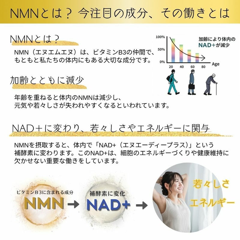 そのNADの活性化としてNMNを補うことで、あなたの“未来の元気と美しさ”を応援します。