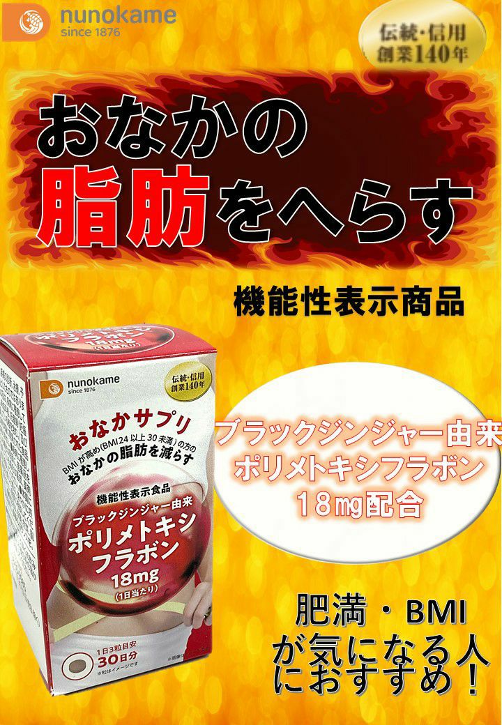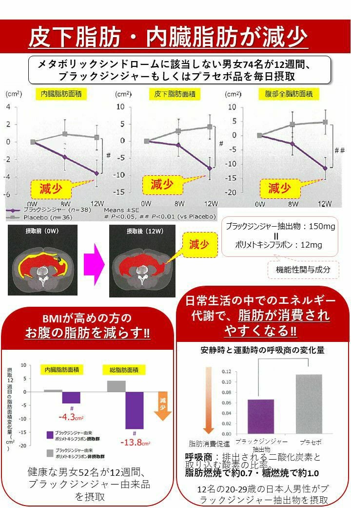 ブラックジンジャー由来ポリメトキシフラボンは、BMIが高め(BMI24以上30未満)の方腹部の脂肪(内臓脂肪及び皮下脂肪)を減らす機能が