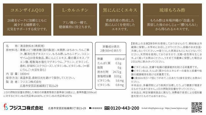 果糖ブドウ糖液糖(国内製造),米黒酢,はちみつ,りんご果汁、難消化性デキストリン,もろみ酢,L-カルニチン,コエンザイムQ10含有食品,黒にんにくエキス,桑の葉エキス/クエン酸,粗製海水塩化マグネシウム,アラニン,ビタミンC,香料,甘味料(スクラロース),ビタミンB6,ビタミンB2,(一部にりんご・大豆を含む)